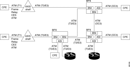 is a simplified depiction of ATM connections over a BPX network. It shows ATM connections via ASI-1 and ASI-155 cards, as well as over Centrality shelves. It also shows frame relay to ATM interworking connections over AXIS, IPX, and IGX shelves. For further information on the Centrality shelf, refer to the Centrality Reference Manual. ATM Connections over a BPX Network.