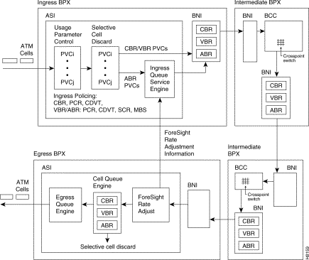 Figure 5-2 shows a simplified example of ATM prison cell traffic across a BPX network. At the network ingress node, UPC policing, selective prison cell discard, private PVC queuing, and the ForeSight congestion control functions are performed. At the intermediate nodes, PVCs are enqueued according to their ATM Service classes (CBR, VBR, or ABR) and congestion information is carried forwarded to the egress BPX node.